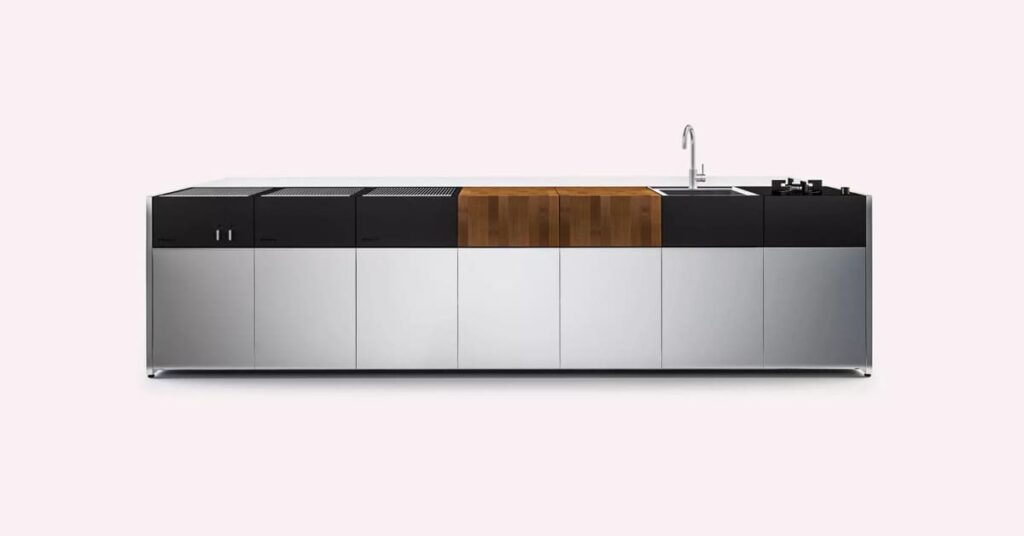 El acero inoxidable, especialmente los grados 304 y 316, es un material clásico en diseños de cocinas exteriores gracias a su: