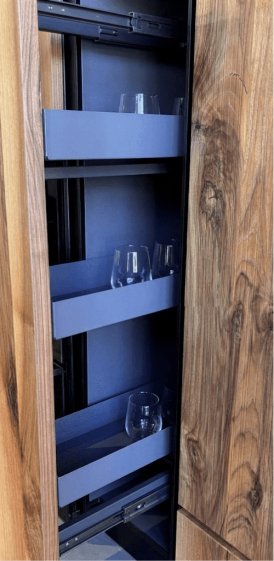 Las puertas extraíbles se deslizan hacia afuera en lugar de abrirse con bisagras. Suelen usarse en muebles con despensas o almacenaje vertical.